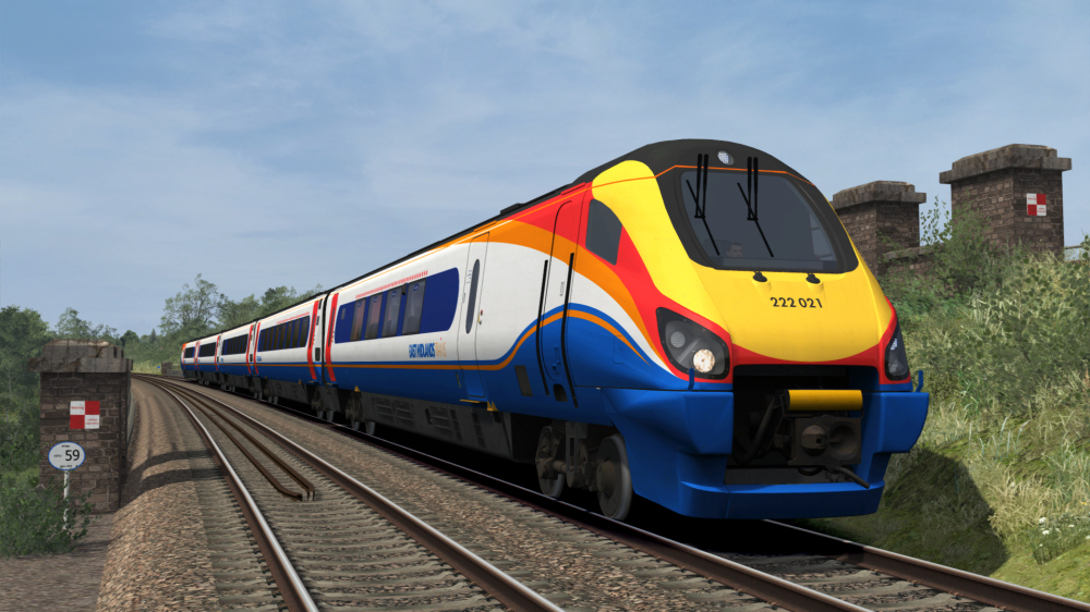 As always, much attention has been given to the audio, using a combination of recordings made at Central Rivers depot in 2016 from their counterpart 'Voyager' and a cab recording from St Pancras to Nottingham in 2023. Class 222s are interesting and fairly unique for a DMU in that they are propelled by electric motors rather than being directly driven by a diesel engine. This means the engine revs up in a different manner which required quite a bit of research and observation to simulate. To summarise, the diesel engine on a Class 222 simply acts as an electricity generator to power the traction motors and as a result, the engine revs up depending on the load being demanded by the motors. When departing from a standing start for example, even if you select full power, the engine at 0mph will not rev up as it is already revving high enough to provide the motors with enough power. This is why the engine revs up a little when the driver selects forward or reverse, to ensure it is ready to provide the necessary power. As speed increases, the engine then gradually revs up to match the load being demanded by the motors. At around 13mph, the engine will rev at its highest rpm, assuming full power is selected, with the turbocharger then spooling up as more load is placed on the engine until 20mph. At 20mph, peak load is reached and the turbocharger has reached its highest speed. In contrast, if running at 20mph or above, selecting full power from idle will have the engine rev up quickly in around 4 seconds. Other unique sounds are also represented such as the vibration you hear in both the cab and from outside when first pulling away, which varies in severity depending on much power you have applied.